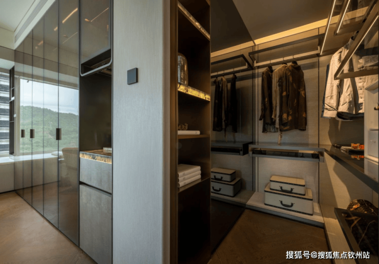 在主卧,除了配置步入式衣帽间,额外预留了一个嵌入式整排衣柜的收纳空间外,而且细分出更多功能区,让整个空间的动线与空间变得更有情趣。比方我们看到空间内放置了小冰箱,打造一个迷你水吧台,男女主人恰恰小酒,看着窗外城市美景,定制专属于星级奢华酒店的松弛感氛围。