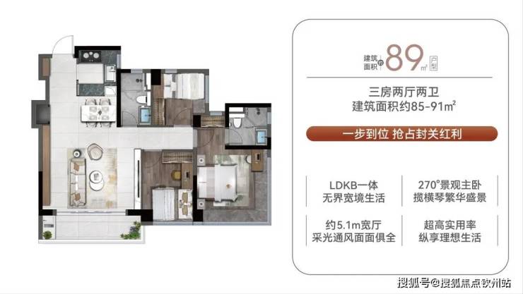 89㎡三房:总价约445万元起,单价约4.95万元/㎡(按总价推算);
