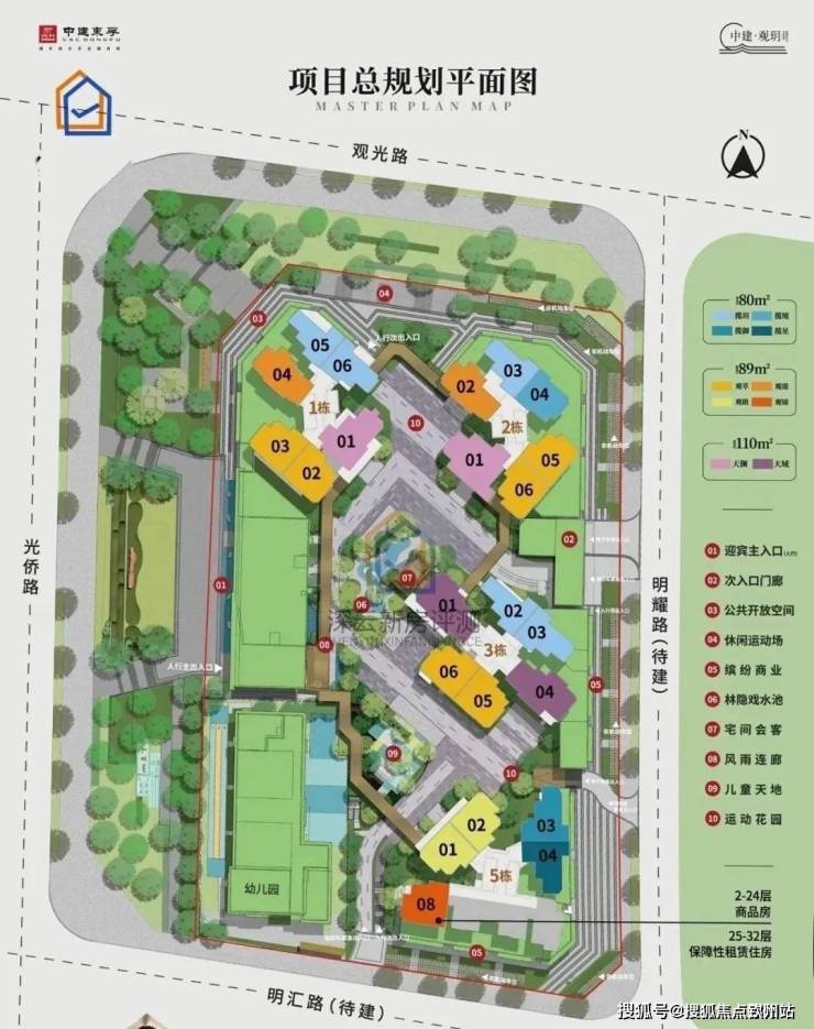 项目占地约14262.5㎡,建筑面积约114898㎡,绿化率为35.1%,容积率5.4。共有5栋建筑,总可售户数为719户,其中1,2,3栋为33层,4栋为3层幼儿园,5栋为32层,是片区内少见的高层建筑,低容积率。