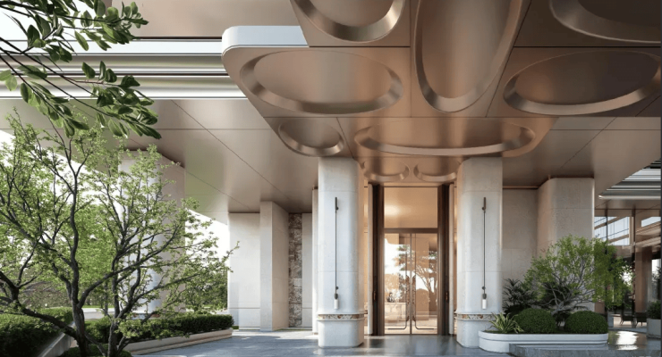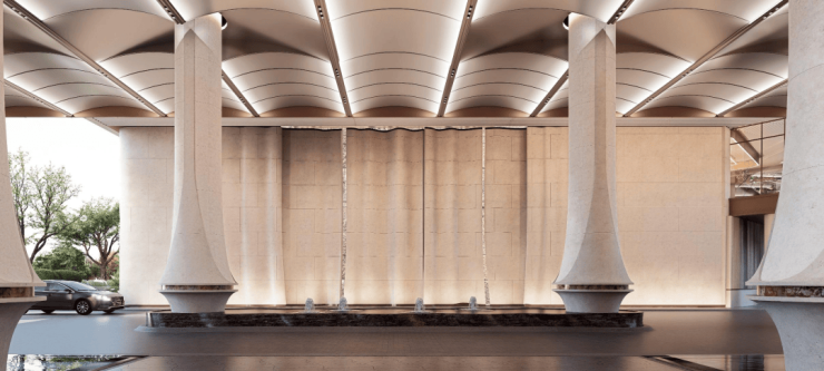 「后海招商玺」车行大门做了殿堂级落客区,设有天幕和水景,非常具备归家仪式感。