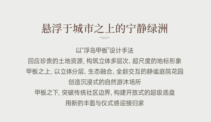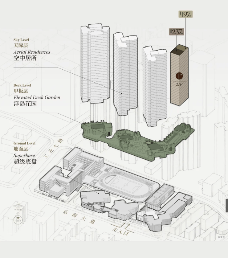 这次「后海招商玺」住宅设计采用“浮岛甲板”设计策略,四栋住宅落于甲板之上,独享甲板庭院花园。进而形成超级社区底盘 + 浮岛绿化甲板的垂直共生人居标杆。