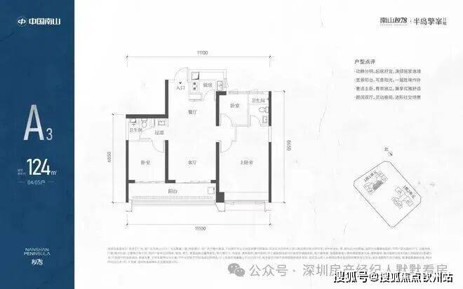 A3也是两条腿,分别是1-1栋04/05,主朝向是东南向,双龙抱珠格局。客厅拥有超大观景阳台,缺点是公卫是个暗卫,小次卧和主卫也对天井外走廊,采光不足。