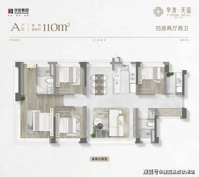 约110㎡四房两厅两卫:约16米通风面,户户是端户;约28㎡行政级端卧套房,270°景观视野,360°环统式采光。