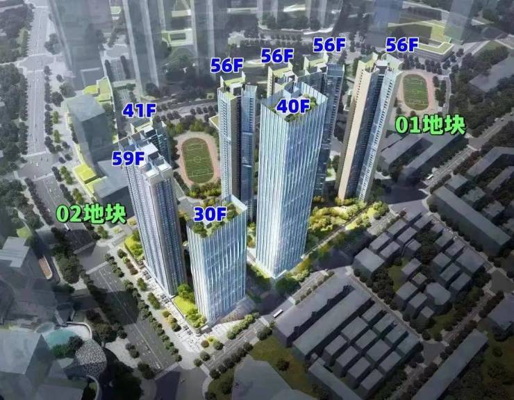 01-02地块,总占地面积约1.23万㎡,总建筑面积约15.08万㎡,计容建筑面积约10.85万㎡,容积率8.31,绿化率40.01%,共由2栋41-59F高的住宅组成,其中3栋住宅41F,4栋公共租赁住房59F,5栋办公楼30F,2栋是1所9班制幼儿园。