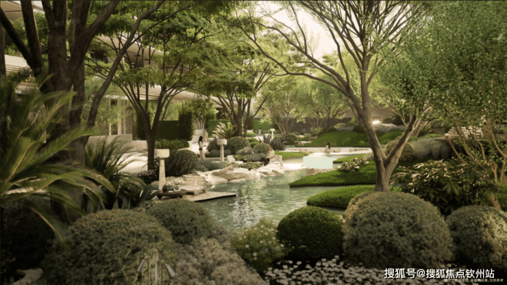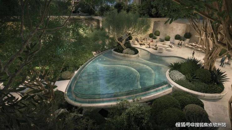 一层亲水,中心是园林的灵魂“海洋之心”,婉如平静的水面镜子,把天光云影、周围的建筑线条、园林绿意,全都倒映其中。