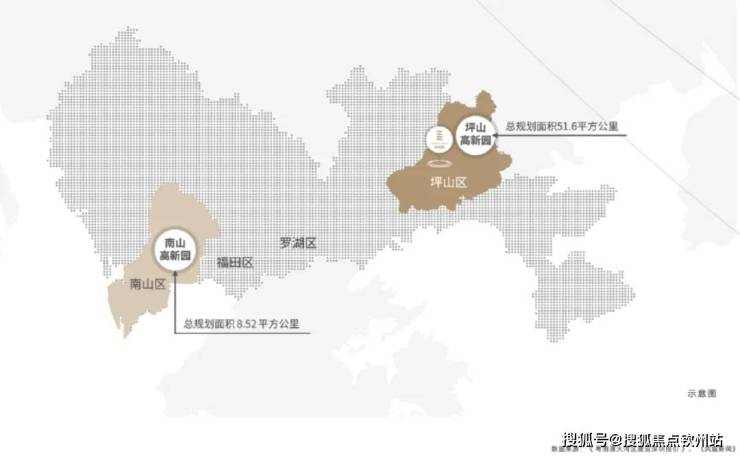 深圳形成"一区两核多园"的高新区发展布局,"两核"中坪山高新园区总面积达51.6平方公里,是南山高新园区(8.52平方公里)的6倍!