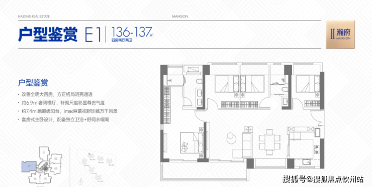 亮点:约6.9m奢阔横厅+约7.4m跑道级阳台,视野与尺度兼得;主卧配置舒阔衣帽间;方正全明设计,避免空间浪费。