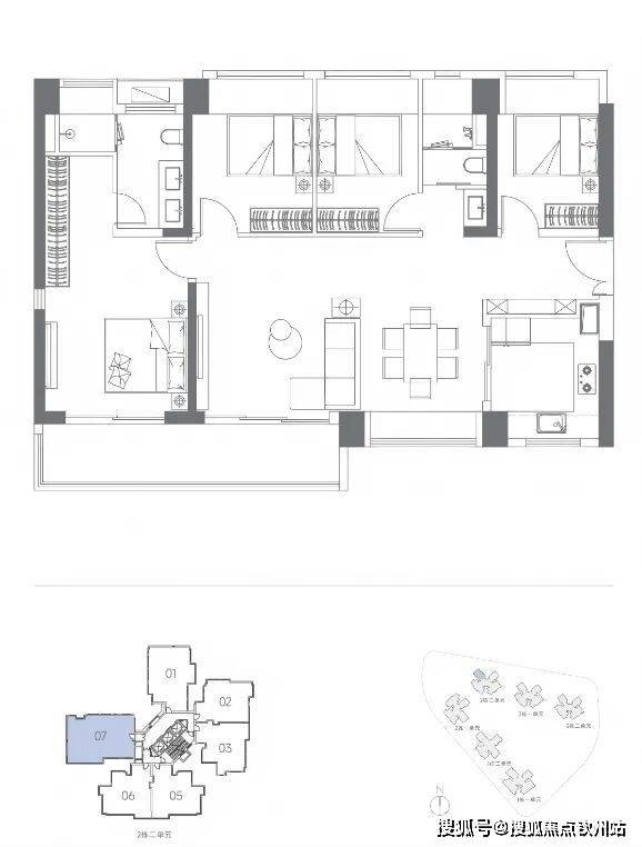 其中,住宅约17万㎡,包含6栋单元楼,共计约1508户。1栋2单元(46F)3梯5户,其余的1栋1单元(47F)、2栋1/2单元(47F)和3栋1/2单元(52-53F)均为3梯6户。同时在4栋规划了约1.2万㎡集中商业,另配建有一所18班幼儿园。