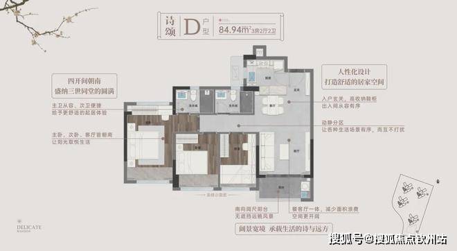 约84㎡的极品户型,拥有超大开间朝南,每个卧室都朝南向,一流的采光通风,满足家人健康舒适生活。