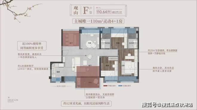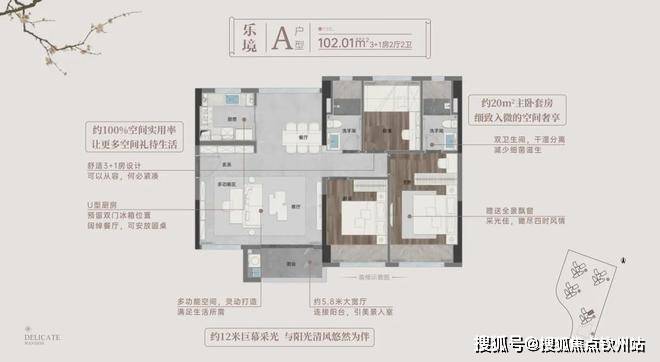 又如建面约102㎡3+1房2厅,近100%使用率,实际上享受到的相当于建面约120㎡户型的空间体验,改善优选。