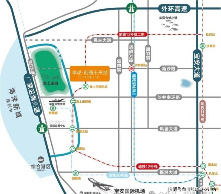 楼下就是12号线海上田园东站,2站到国展北站可以换乘20号线,10分钟可达机场T1/T2航站楼,6站到福永站可以换乘11号线,15-20分钟到南山科技园。
