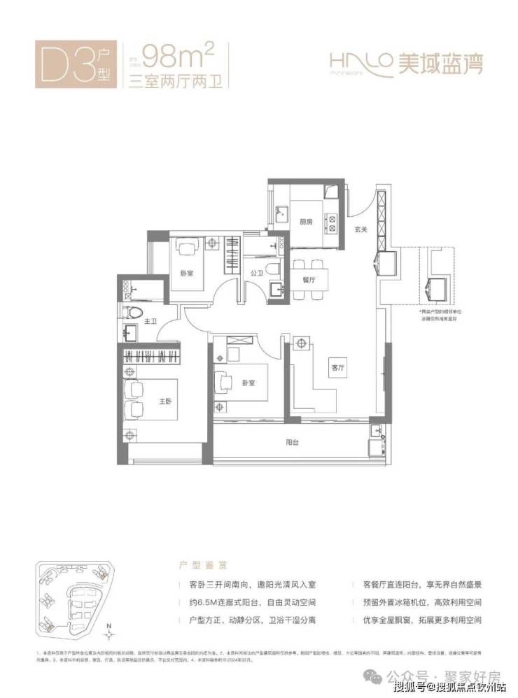 D1户型-98㎡的3房2厅2卫,设计的是竖厅格局,客厅连接次卧出阳台(有6.5米长),三开间朝南,S墙设计预留冰箱位,U型厨房,得房率:80.12%(不含赠送),有西南向或东北朝向。