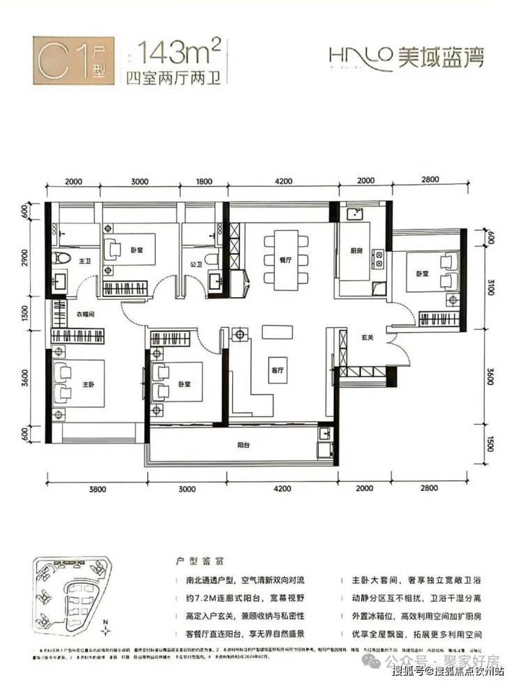 ,设计的是竖厅格局,其实整个室内布局是跟D1户型一模一样的,得房率:80.12%(不含赠送),只不过朝向更佳,全部都是东南朝向。D2户型-102㎡的3房2厅2卫,设计的是竖厅格局,客厅连接卧室出阳台(有6.4米长),四开间朝南,S墙设计预留冰箱位,主卧双飘窗南北对流,U型厨房,得房率:80.11%(不含赠送),有东北向或西南朝向。A2户型-112㎡的4房2厅2卫,设计的是竖厅格局,客厅连接次卧出阳台(有6.5米长),四开间朝南,S墙设计预留冰箱位,主卧双飘窗南北对流,U型厨房,得房率:80.12%(不含赠送),有西南或东北朝向。144㎡的4房2厅2卫,设计有2个户型,1个是类似于双龙抱珠的格局,正南朝向,1个是南北通透格局,得房率:77.03-77.13%(不含赠送),位于楼王单位,俯视小区全景。