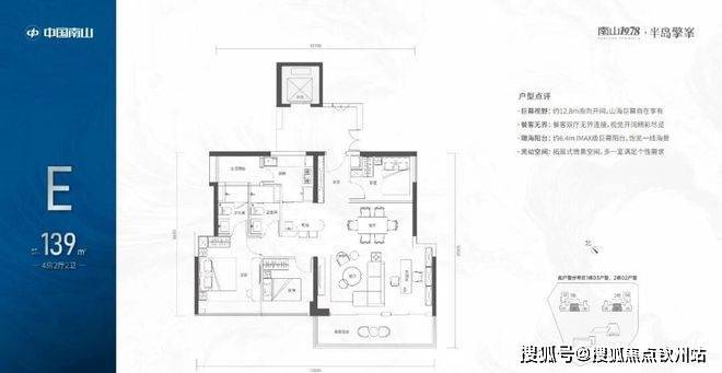 【139㎡的4房2厅2卫】1栋03/2栋02高区户型,电梯入户送独立公区,竖厅类双龙抱珠格局,四开间朝南,主卧大套间设计,有1个多功能间可以做书房,6.4米长观景大阳台,L型厨房带1个生活阳台,卫生间干湿分离,得房率:72.07%(不含赠送),西南朝向;