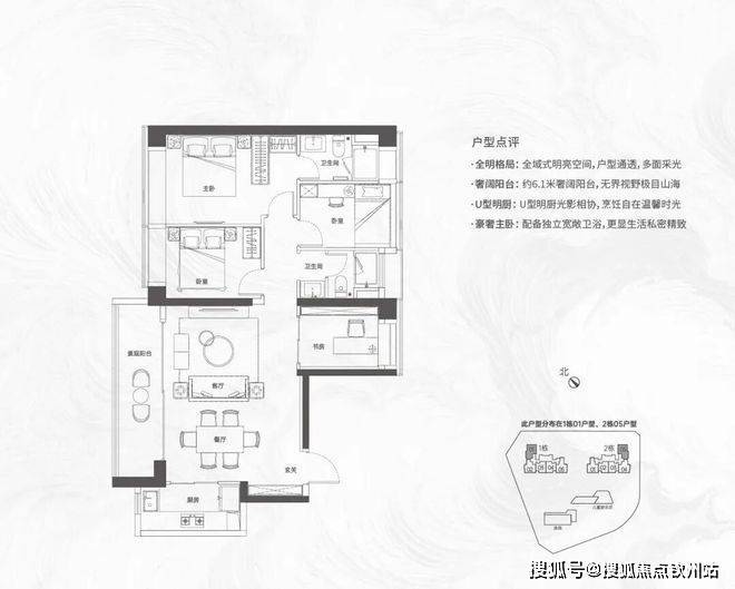 【124㎡的4房2厅2卫】1栋01/2栋05户型,电梯入户送独立公区,横厅南北通透格局,客餐厅6.1米开间,五开间朝南,主卧大套间设计,6.1米长观景大阳台,U型厨房,得房率:72.07%(不含赠送)西北或东南朝向;