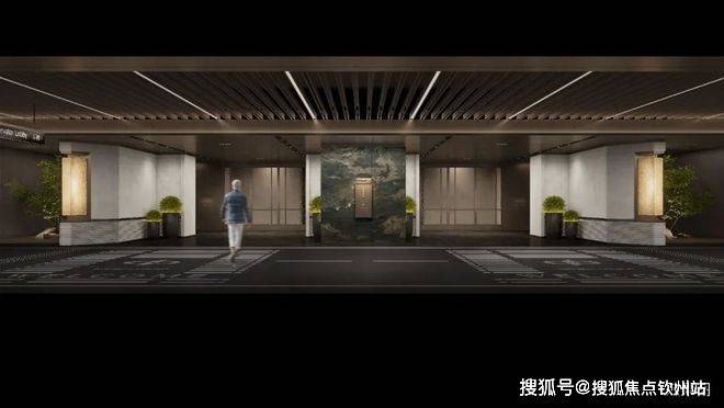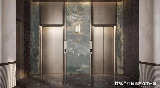 车库双大堂设计,大面积采用天然浅色石材,并于天然奢石加以点缀,光厅顶面采用金属构件,结合灯带,增加层次感,彰显项目高定品质。