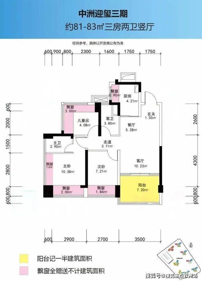 该户型为竖厅格局设计,主卧和儿童房均采用双飘窗设计,增加了室内空间的灵活性和舒适性,采光通风较好,且82㎡可以做到3个卧室、2个卫生间,这个使用率在市面上属于上乘。