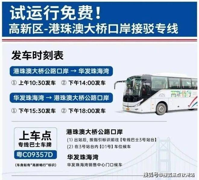 随着"港车北上"政策深化,特设高新区华发·珠海湾——港珠澳大桥口岸接驳专线,设置珠海湾站,试运行期间免费搭乘,让港澳同胞出行更加便捷。