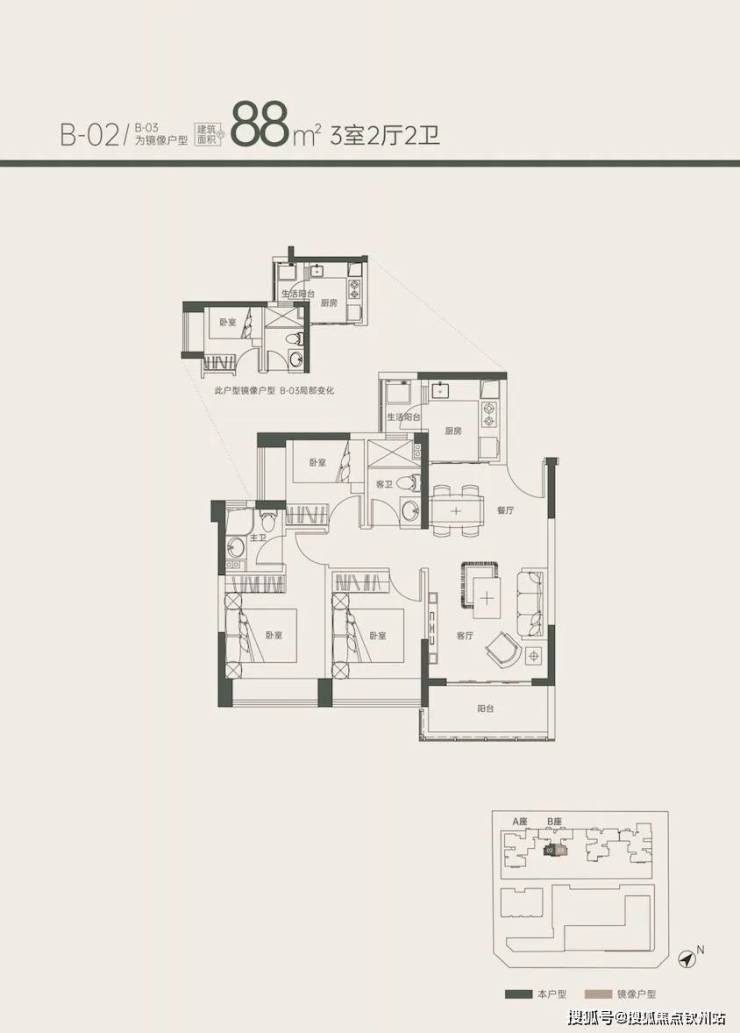 88㎡3房2卫 58套