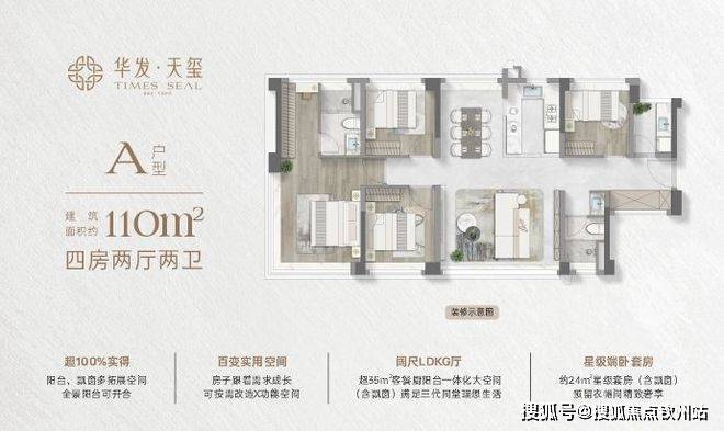 约110㎡四房两厅两卫:约16米通风面,户户是端户;约28㎡行政级端卧套房,270°景观视野,360°环统式采光