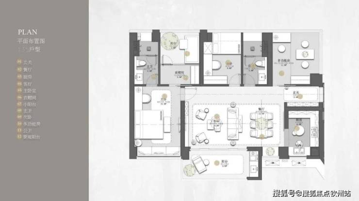 135㎡的3房2厅2卫,135㎡三房两卫,横厅格局,南北双阳台设计,9.8㎡南向主阳台,三个房间面积分别达到9/11/15㎡,主卧带衣帽间和卫生间,舒适度非常好。