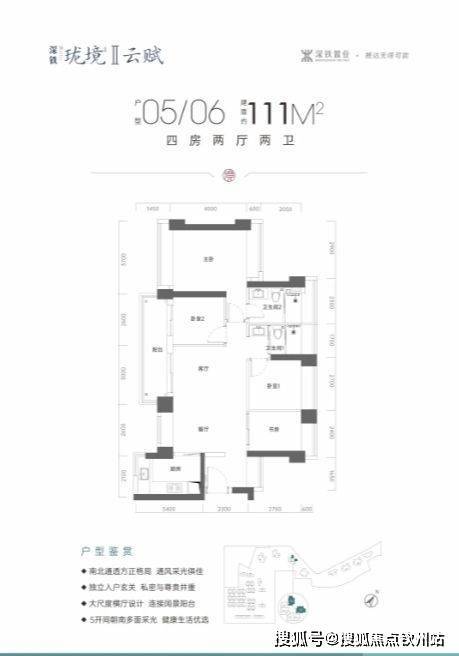 111㎡四房两厅两卫:横厅南北通透,五开间朝南,客厅连接次卧出6.15米大阳台,U型厨房,卫生间干湿分离,得房率约75.4%,阳台主朝东南或西南向,部分户型可看阳台山景。