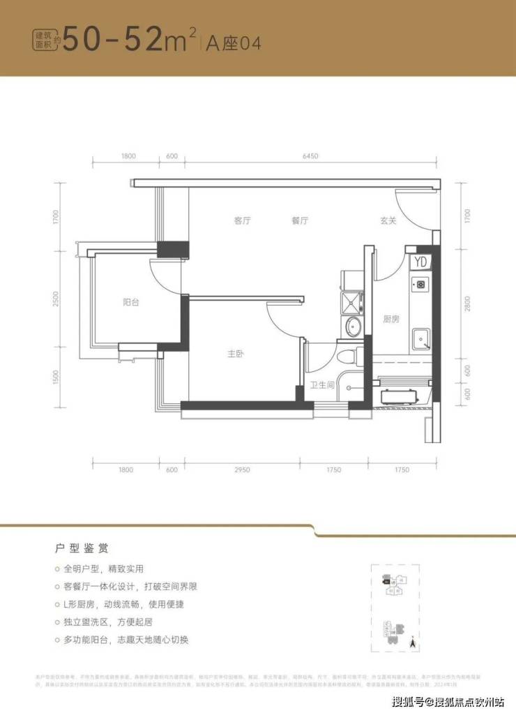 建面约50㎡上车小户,全明户型,客厅带飘窗,三分离卫浴,无过道零空间浪费。