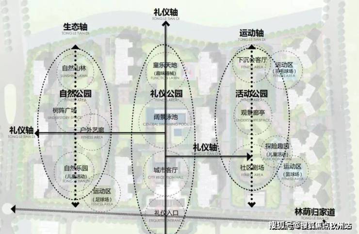 再比如,小区内规划为“一道三轴三园十五区”,一道为霸气归家道,三大主题轴线:礼仪轴、运动轴、生态轴串联多个功能板块……