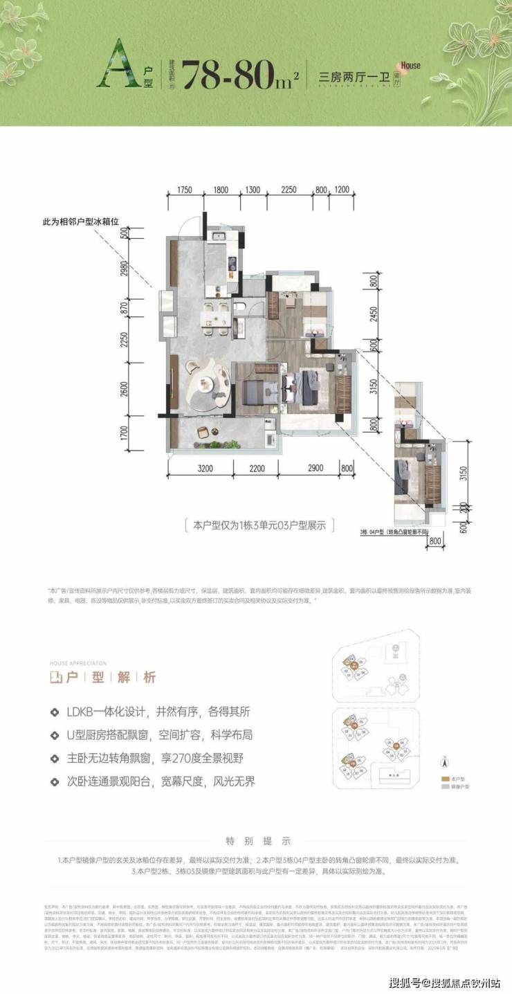78-80㎡的3房2厅1卫,设计的是竖厅格局,客厅3.2米开间,LDKB一体化,S墙设计预留冰箱卡槽位,动静分区,主卧270无边转角飘窗,3个卧室分别做到了主卧16.62㎡/次卧9.27㎡/次卧5.72㎡(包含墙体飘窗),客厅连接次卧出5.4米长的大阳台,U型厨房,卫生间三段式分离,得房率约93-99%(包含赠送),西北朝向。