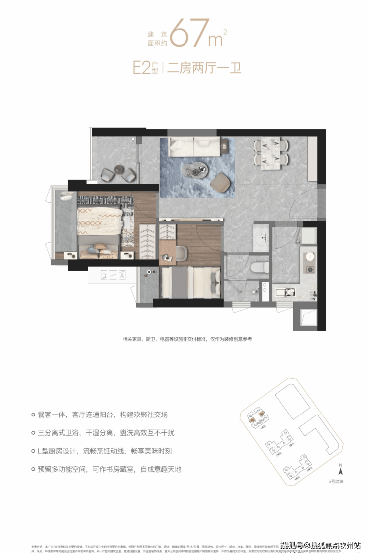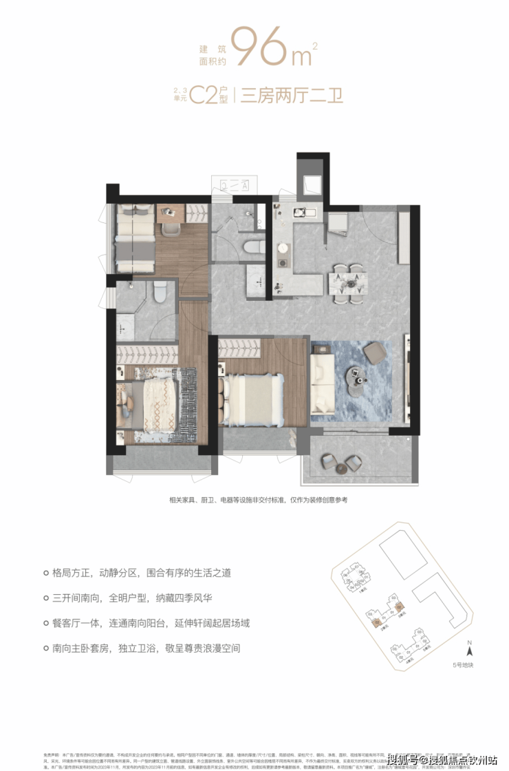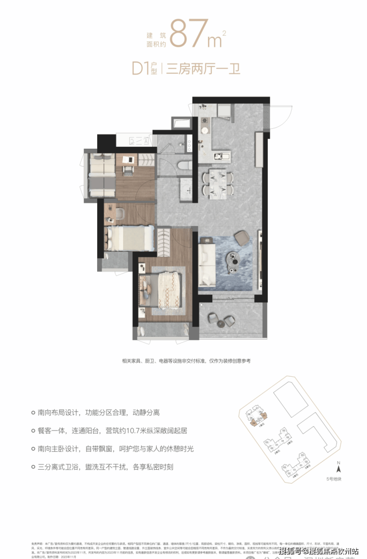 “10.7 m纵深紧凑南向三房”,10.7 m纵深餐客一体,通风采光极佳
