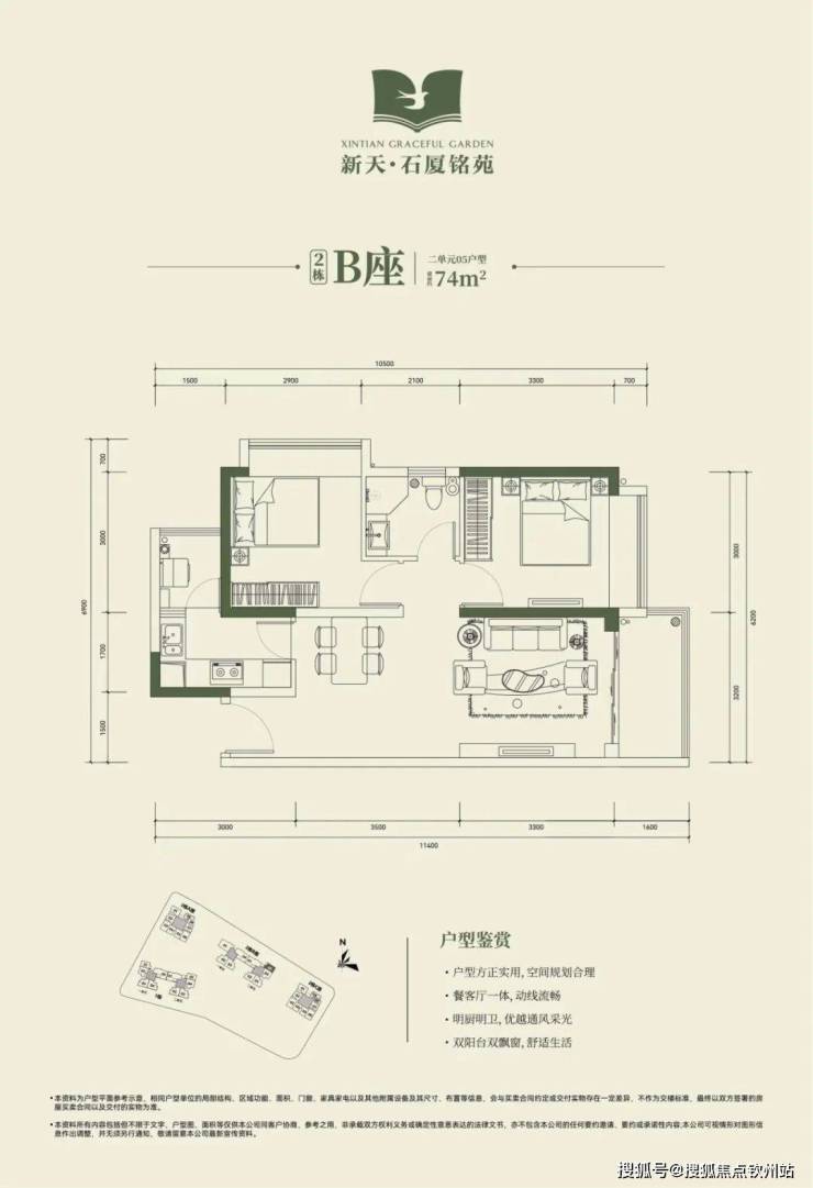 2栋B座二单元04、05户型:面积约为72-74㎡的2房2厅1卫
