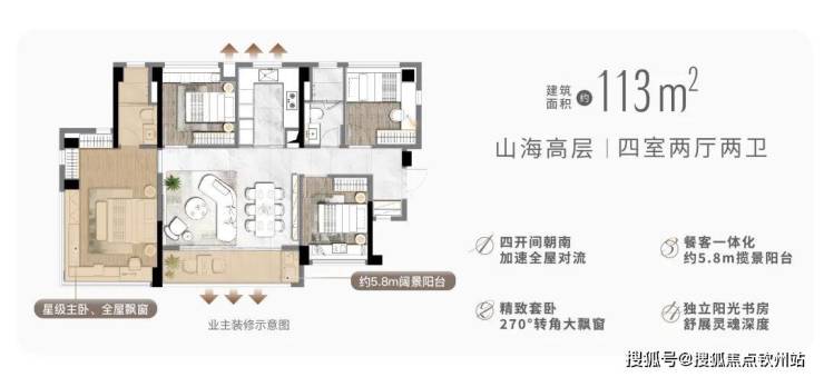 约5.8m阔景阳台,抬眼山海城园四重复合景观,搭载全屋飘窗,让生活被柔和的清晨阳光一点点唤醒。