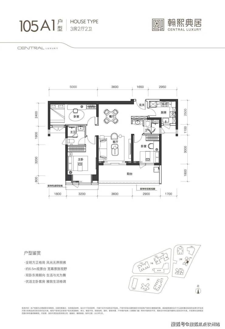 (1)105㎡3房2卫:双龙抱珠格局,朝东/南,阳台开间6.5米,适合刚需家庭。
