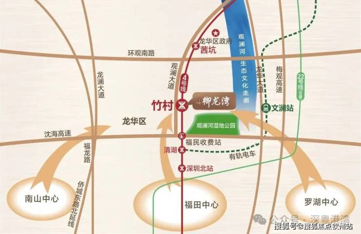 轨道交通:地铁4号线竹村站上盖,商业MALL直连,停车场直连地铁出入口,7站速达深圳北、13站钟直达福田中心,对接深港生活圈;有轨电车文澜站,直线距离约500米,地铁22号线(在建中)。