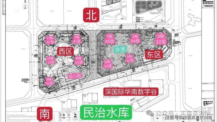 项目分为两期开发,从设计图可以看出,项目共分为东西两个地块建设,中间规划一条市政路,采用点阵式布局,10栋超高层塔楼围合组成,部分户型南向可看民治水库景观。