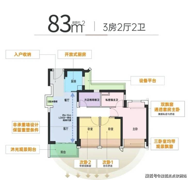 83平米三房两卫(竖厅):设计的是经典竖厅格局,客厅3.2米开间,四开间朝南,S墙设计预留冰箱卡槽位,3个卧室分别做到了主卧11.97㎡/次卧8.75㎡/次卧8.22㎡(包含墙体飘窗),公卫带1个4.68㎡的设备平台,得房率约:97%(包含赠送),西南朝向。