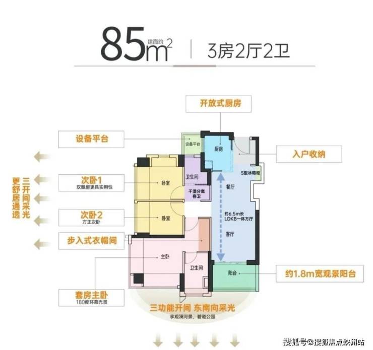 85平米三房两卫:设计的是竖厅格局,客厅3.2米开间,三开间朝南,3个卧室分别做到了主卧16.41㎡/次卧7.71㎡/次卧7.4㎡(包含墙体飘窗),公卫带2㎡的设备平台,得房率约:97%(包含赠送),东南朝向看观澜河景观。