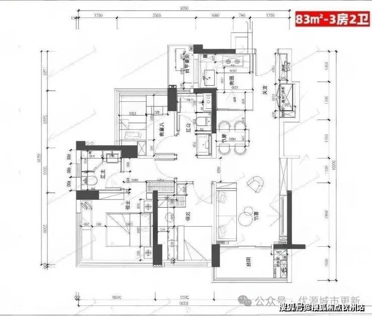 83㎡的3房2厅2卫,设计的是经典竖厅格局,客厅3.35米开间,LDKB一体化,S墙设计预留双开门冰箱卡槽位,三开间朝南,动静分区,U型厨房,公卫三段式干湿分离,赠送1.98平设备平台,得房率约77.15%(不含赠送),阳台5.02m²西南或东南朝向。靓点:83平做到了3房2卫,主卧270°无柱转角飘窗,厨房烟道外置+额外赠送设备平台,并且是纯南向格局。