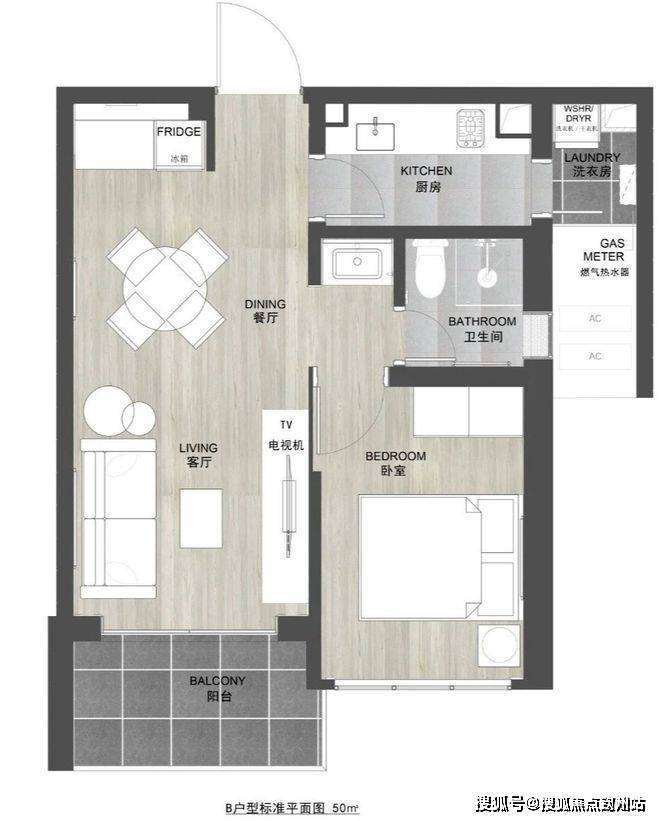 50㎡1房,带生活阳台,传统一房一厅布局。