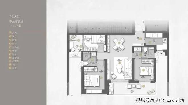 (1)105㎡3房2卫:双龙抱珠格局,朝东/南,阳台开间6.5米,适合刚需家庭。