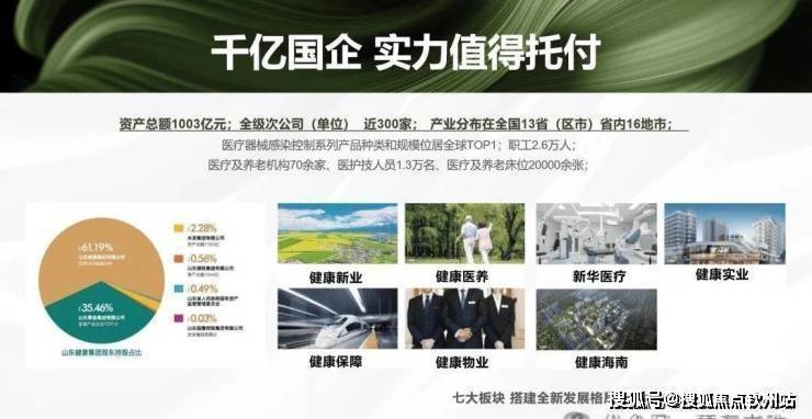 PART.03 | 千亿国企 山东健康旗下健康实业进驻上海、山东、广东、海南、新疆等12省(市),开发项目95个,荣获中国品牌房地产100强,省属国有企业中最大康养地产开发企业等荣誉资质。打造国家康居示范工程,国匠实力,值得托付。