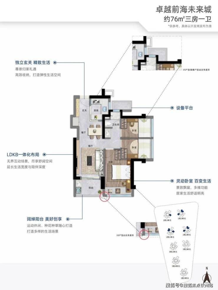 76㎡的3房2厅1卫,设计的是竖厅格局,进门入户玄关,客厅3.05米开间,LDKB一体化,S墙设计预留冰箱位,3个卧室分别做到了2.95米/2.3米/2.15米的宽度,U型厨房,卫生间三段式分离,还带1个设备平台可以使用,得房率约:89%(包含赠送),阳台有朝东北、东南或西南向