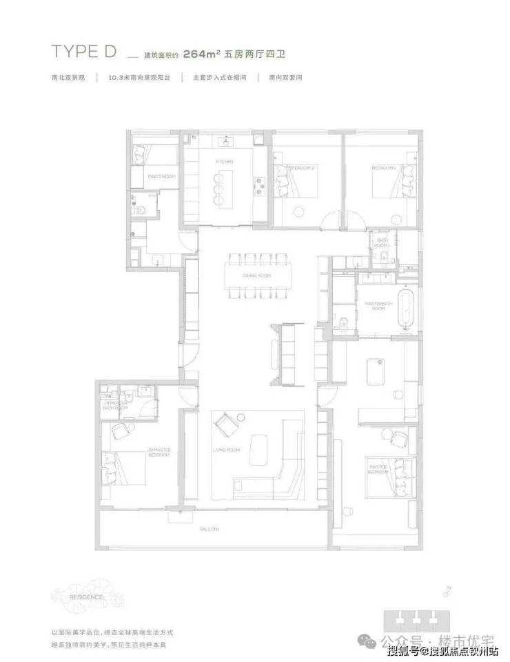 264㎡为五房两厅四卫产品,更细腻的产品设计,超奢华四件套南向主卧,标准南向次主卧, 6.6米巨型方厅,纵向超长LDK一体化空间,专属家政保姆空间,超大容量收纳空间,令居住的尊贵从每处品质细节里流露而出,创造独一无二的奢享体验。