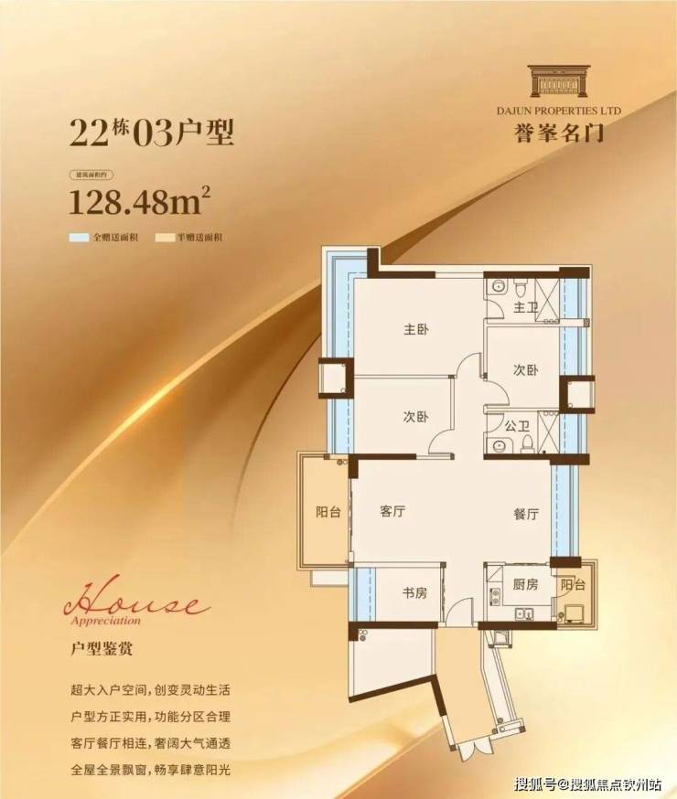 户户朝南全明采光,畅享大尺度入户花园,自由定制归家仪式感,户型通透舒适度高,超高使用率极尽空间美学,动静功能分区明朗,让家人的不同爱好都能找到专属的小天地。