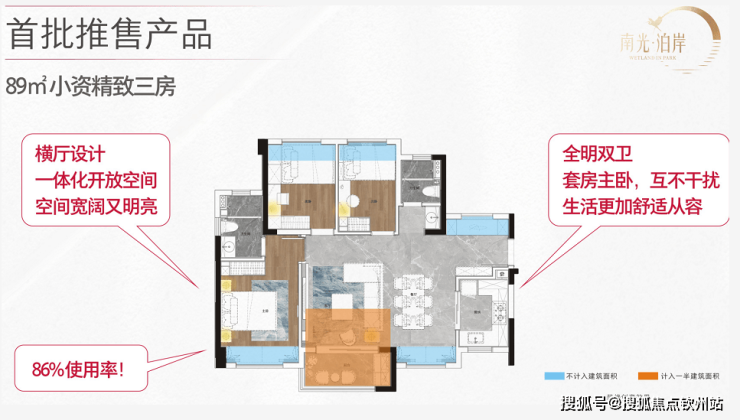 其中1、2、3、5、7栋,为18层高的小高层住宅,两梯五户设计,打造有两种产品,分别为75㎡东南向三房和89㎡三房两厅两卫(横厅设计)。