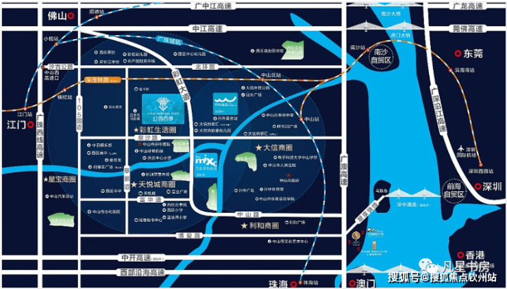 3.双百亿之城 焕新中山新中心:@西区彩虹片区一一众多知名开发商抢驻,依托两大百亿级城市名片,将打造成集生活居住、商业贸易于一体的城市中央居住区,是城区外溢发展最集中的片区。“马山项目”一拟规划以万象系列商圈、马山城市公园、岐江美丽水岸以及时尚开放社区四大组团,打造成中山城区百万方中心地标,本案距离该地块仅约2千米。