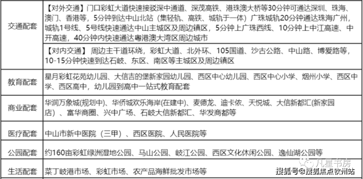 @ 周边商业配套有万象系列产品(规划中)、欢乐海岸(在建中)、麦德龙、迪卡侬、天悦城、大信新都汇(新家园店)、兴中广场等。@周边教育配套有星月彩虹花苑幼儿园、大信吉的堡新家园幼儿园、西区中心幼儿园、西区中心小学、中山市西区高中(在建)。@周边公园配套有约160亩彩虹绿洲湿地公园。