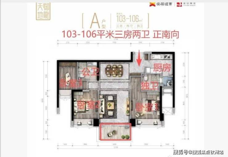【户型解析103-106平米三房两卫 双龙抱珠户型】客厅朝正南向 客厅带阳台 采光很好 看别墅片区 采光视野都很好