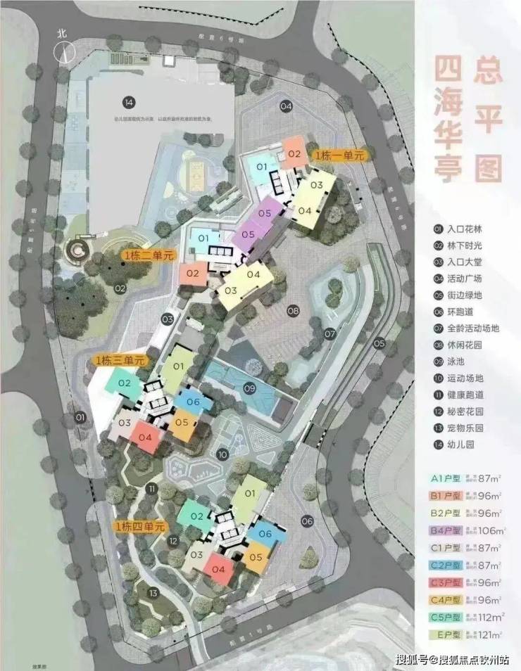 四海华亭,占地面积约1.7万㎡,建筑面积约16.4万㎡,容积率6.81,绿化率30.59%,共4栋51-52层高住宅,由1栋1-4单元组成,其中1栋1.2单元是3梯5户设计,1栋3.4单元是4梯6户设计,可售商品房有1044套,车位数1249个。