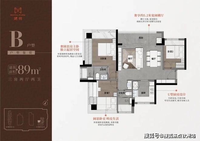 89㎡的3房2厅2卫,B户型(1栋1单元07户型),设计的是横厅南北通透格局,进门入户玄关,客餐厅5.2米开间,LDKB一体化,S墙设计预留冰箱卡槽位,三开间朝南,主卧+1个次卧双面大飘窗,客餐厅出5.2米宽景阳台,U型厨房,公卫三段式分离,得房率76.77%(不含赠送),套内面积68.95㎡,阳台主朝西北向。